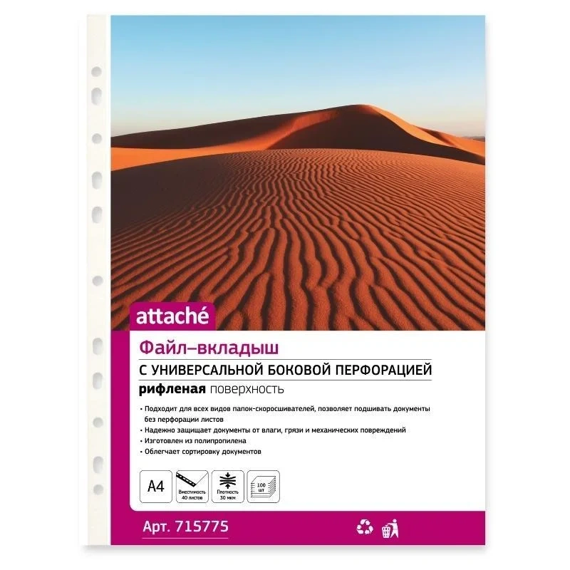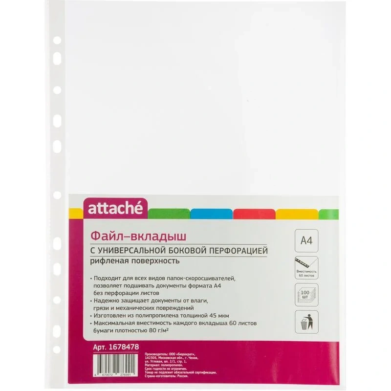 Файл-вкладыш А4 Attache прозрачный, с перфорацией, 80мкм, 100шт/уп