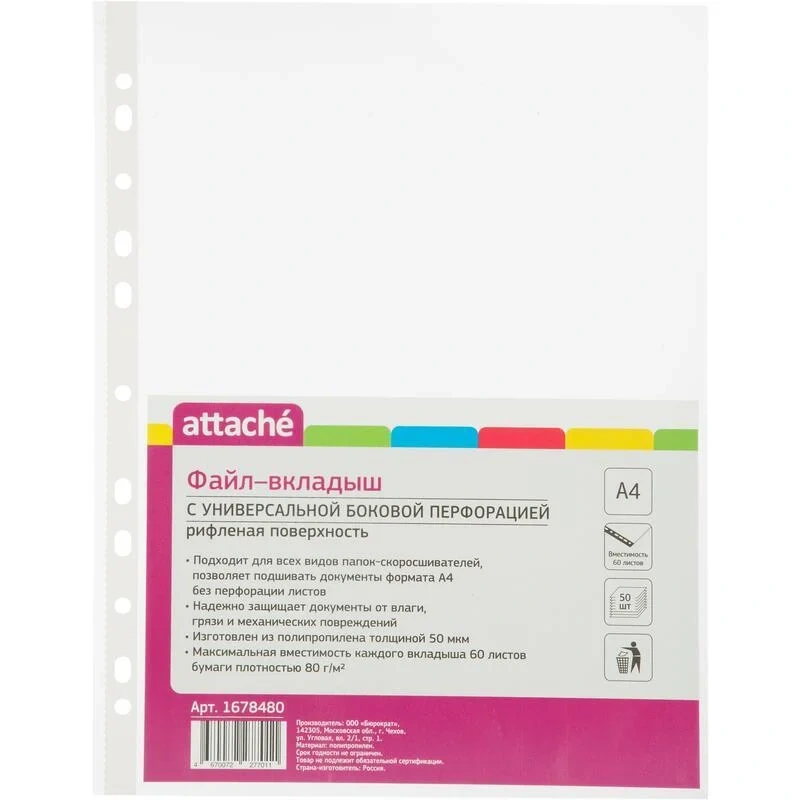 Файл-вкладыш А4, 50мкм, Attache, рифленый, 50шт/уп