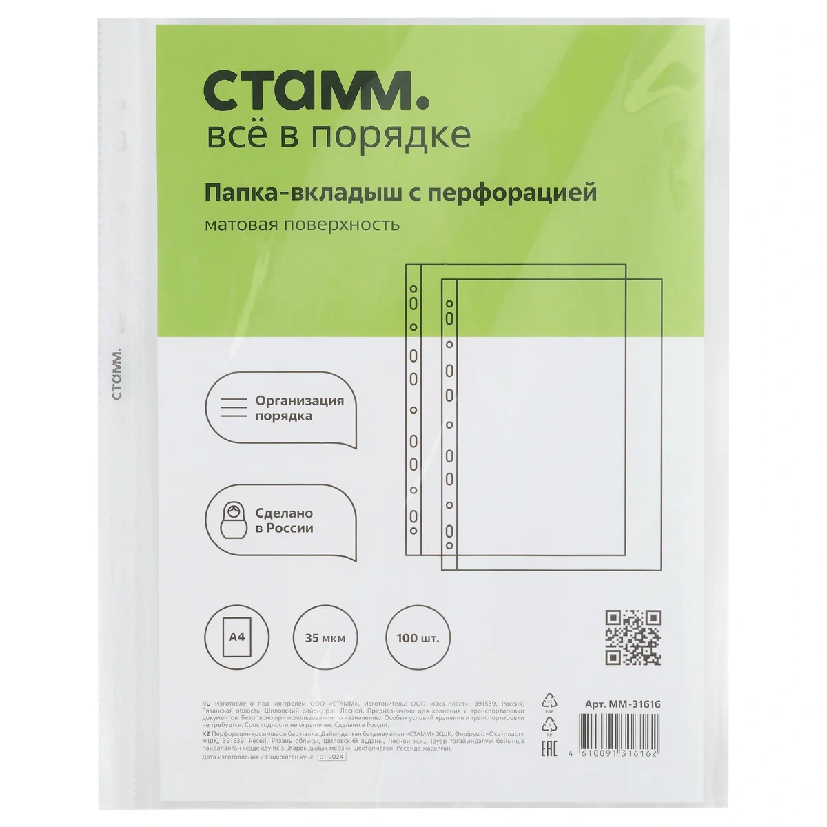Папка-вкладыш с перфорацией (файл) СТАММ А4, 35мкм, матовая 100 шт