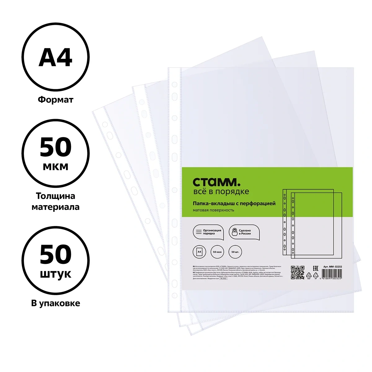 Файл-вкладыш А4 Стамм А4 50мкм, матовая, 50 шт