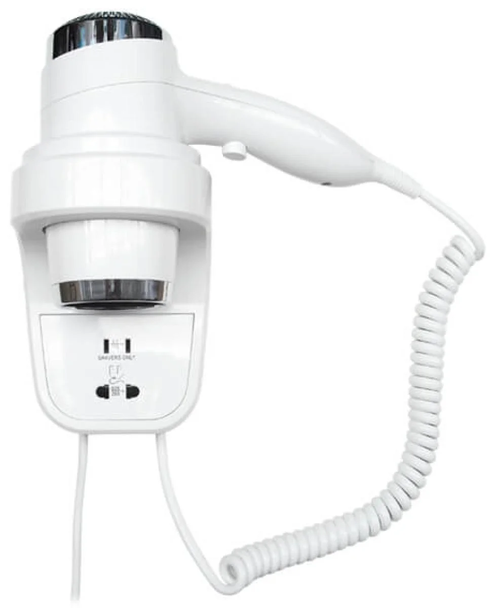 Фен настенный белый 1800-2200 W. Корпус из белого ABS пластика. Оборудован мощным двигателем до 2200W и розеткой для бритвы. В розетку кроме устройств для бритья можно подключать плойку для волос, зарядку для телефона и прочие электроприборы. Устройство можно подключить к открытой или скрытой проводке. Аппарат имеет 2 режима работы.
