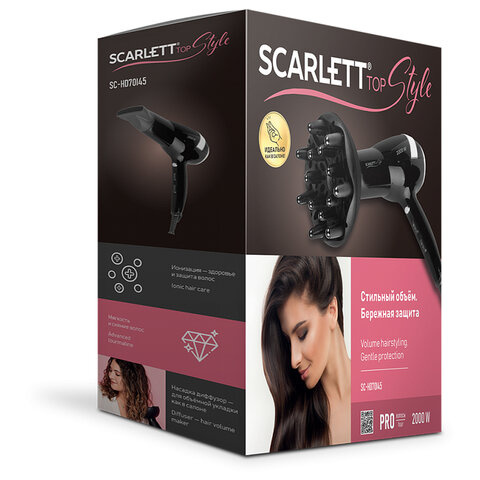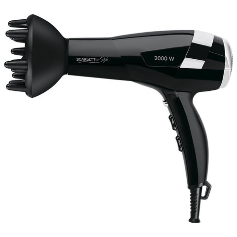 Фен SCARLETT SC-HD70I45, мощность 2000 Вт, 2 скорости, 3 температурных режима, ионизация, холодный в