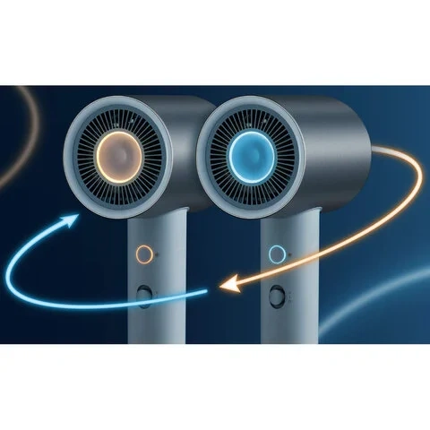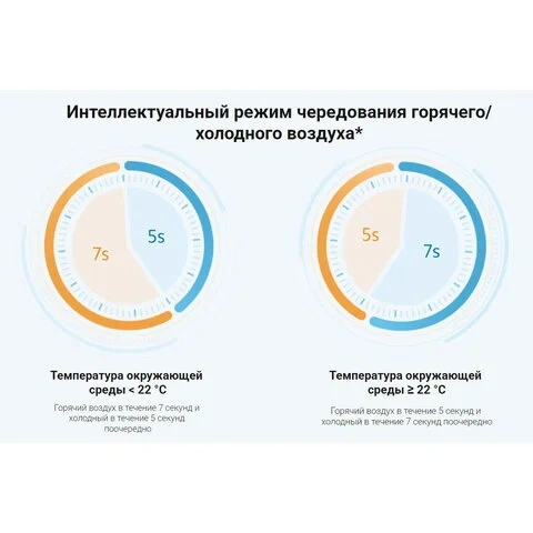 Интеллектуальная функция регулировки температуры НТК автоматически настраивает временной интервал между подачей горячего и холодного воздуха в зависимости от температуры окружающей среды, обеспечивая комфорт, а также сохраняя волосы и кожу головы здоровыми.