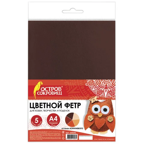 Плотность - 170 г/м2 и толщина в 2 мм гарантируют поделкам отличное качество и долгий срок службы. Цветной фетр формата А4 поставляется в упаковке по 5 листов, в 5 различных оттенках коричневого цвета. Такое разнообразие придется по вкусу любому покупателю. Фетр Остров Сокровищ обладает приятной нежной фактурой, прост и удобен в использовании. Края не осыпаются при разрезании, благодаря чему не нуждаются в дополнительной обработке.