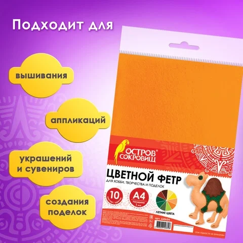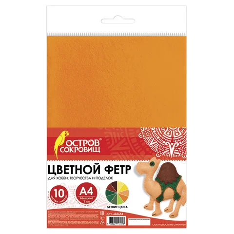 Плотность - 160 г/м2 и толщина в 1 мм гарантируют поделкам отличное качество и долгий срок службы. Цветной фетр формата А4 поставляется в упаковке по 10 листов, 10 теплых насыщенных цветов. Такое многообразие оттенков придется по вкусу любому покупателю. Фетр Остров Сокровищ обладает приятной нежной фактурой, прост и удобен в использовании. Края не осыпаются при разрезании, благодаря чему не нуждаются в дополнительной обработке.