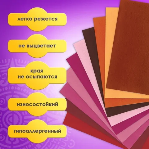 Фетр цветной для творчества Brauberg Солнечный 10 цветов, А4, 10 листов