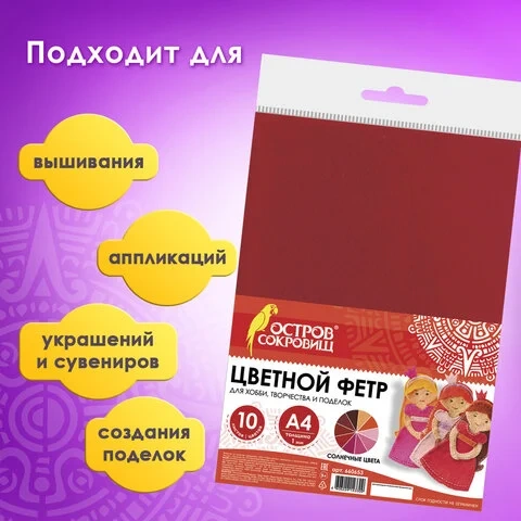 Плотность - 160 г/м2 и толщина в 1 мм гарантируют поделкам отличное качество и долгий срок службы. Цветной фетр формата А4 поставляется в упаковке по 10 листов, в 10 различных оттенках красного цвета. Такое разнообразие придется по вкусу любому покупателю. Фетр Остров Сокровищ обладает приятной нежной фактурой, прост и удобен в использовании. Края не осыпаются при разрезании, благодаря чему не нуждаются в дополнительной обработке.