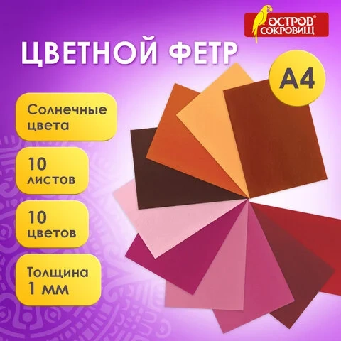 Творчество и создание настоящих шедевров станет доступнее с цветным фетром Остров Сокровищ! Гипоаллергенный материал, созданный на современном оборудовании, прекрасно подходит не только для взрослых, но и для детей, и рекомендуется для использования в различных образовательных учреждениях.
