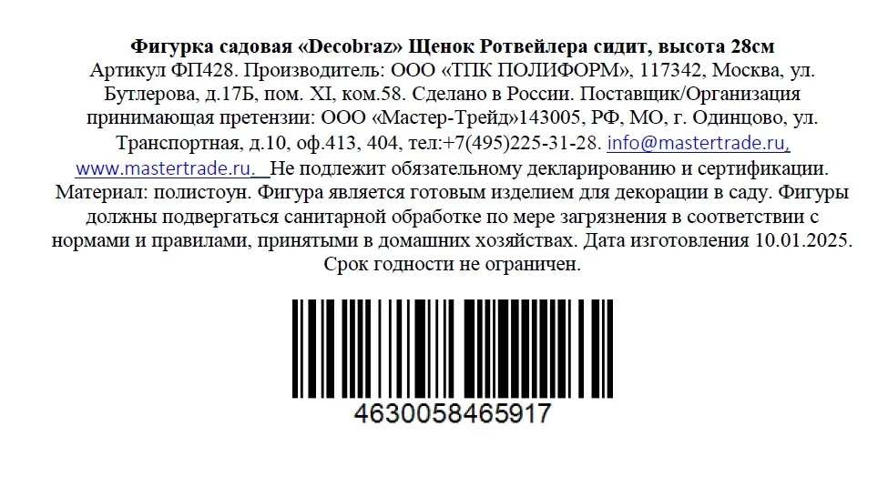 Фигурка Decobraz щенок ротвейлера, 28 x 17 x 22см