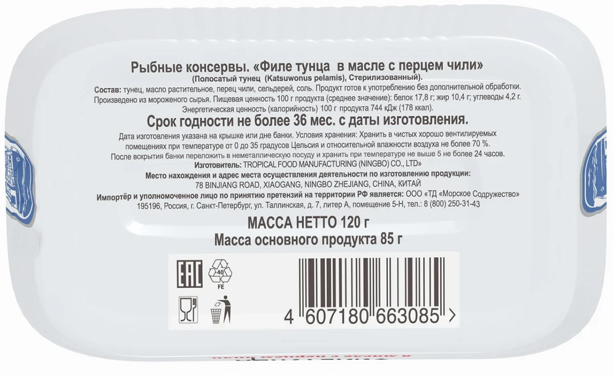 Филе тунца (Полосатый тунец (Katsuwonus) в масле с перцем Чили. Ручная укладка. Продукт готов к употреблению, в качестве ингредиента или как самостоятельная закуска. Добавляют в салаты, готовят с ним ароматные супы, берут на дачу и в поход. Тунец ценится за высокое содержание важных для организма компонентов: витаминов, жирных кислот, других микроэлементов. Он обладает отлично сбалансированным составом макроэлементов: калия, железа, селена, йода. Эта рыба сочная, сытная, а по содержанию белка не уступает телятине. Продукт идеально дополняет многие блюда, а перец чили придает ему яркую острую нотку. Закусочный сэндвич с рыбой на хлебцах или багете станет удачным перекусом и подойдет для пикника. Котлеты, бутерброды, плов и много других аппетитных блюд легко приготовить с консервированным тунцом.