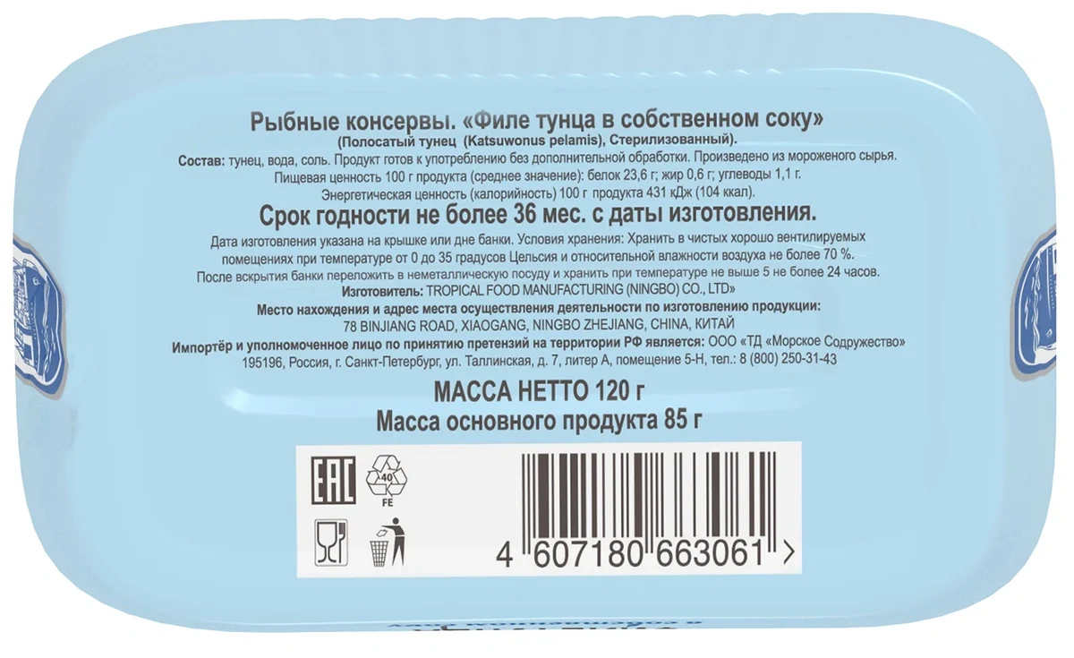 Филе тунца (Полосатый тунец (Katsuwonus) в собственном соку. Ручная укладка. Продукт готов к употреблению, в качестве ингредиента или как самостоятельная закуска. Это вкусный, легкий и полезный продукт в удобной банке с ключом для открывания. Мясо тунцов отличается самым большим среди всех рыб содержанием белков. Мясо тунца содержит кальций, магний, натрий, калий, фосфор, хлор, сера, йод, железо, цинк, медь, витамины А, В1, В2, В6, В9, Е, РР. Хорош сам по себе, а также используется для салатов, овощных гарниров, закусок.