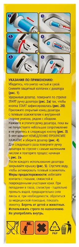 Одновременно моющее и освежающее средство для унитаза длительного действия. Благодаря равномерному смыванию гелевого диска освежитель WC с дозатором препятствует отложению известкового налета, водного и мочевого камня, уничтожает бактерии. Распространяет приятный аромат и пену.
