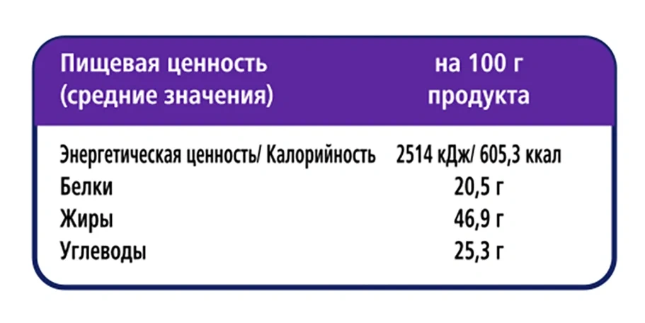 | Энергетическая ценность, ккал/100 г | 605.3 |