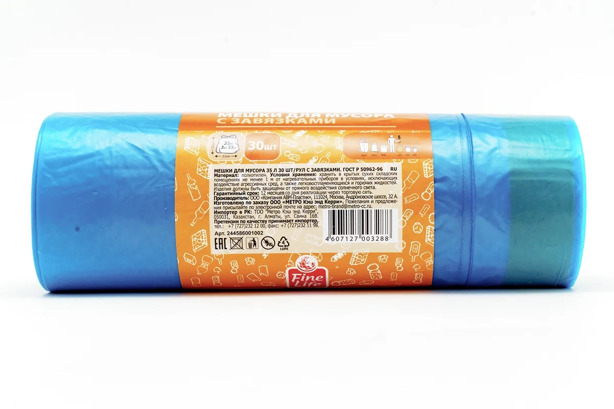 METRO PROFESSIONAL Мешки для мусора с завязками, 35 л, 30 шт. подходят для использования дома, в офисе. Это одноразовые изделия, которые предназначены для сбора мусора. Их изготавливают из прочного полиэтилена. Этот материал полностью безопасен для человека. При контакте с пищевыми продуктами не выделяет вредных и токсичных веществ. Для удобства предусмотрены завязки, которые позволяют надежно закрыть мешок, когда он наполнится. Мешки способны выдерживать значительный вес. Они не имеют срока годности. Для их сохранности следует соблюдать правила, указанные производителем. Недопустимо хранить полиэтиленовые пакеты вблизи нагревательных приборов. Не следует оставлять их под прямыми солнечными лучами (на балконах, подоконниках и в других местах) или в помещениях с температурой выше 400С.