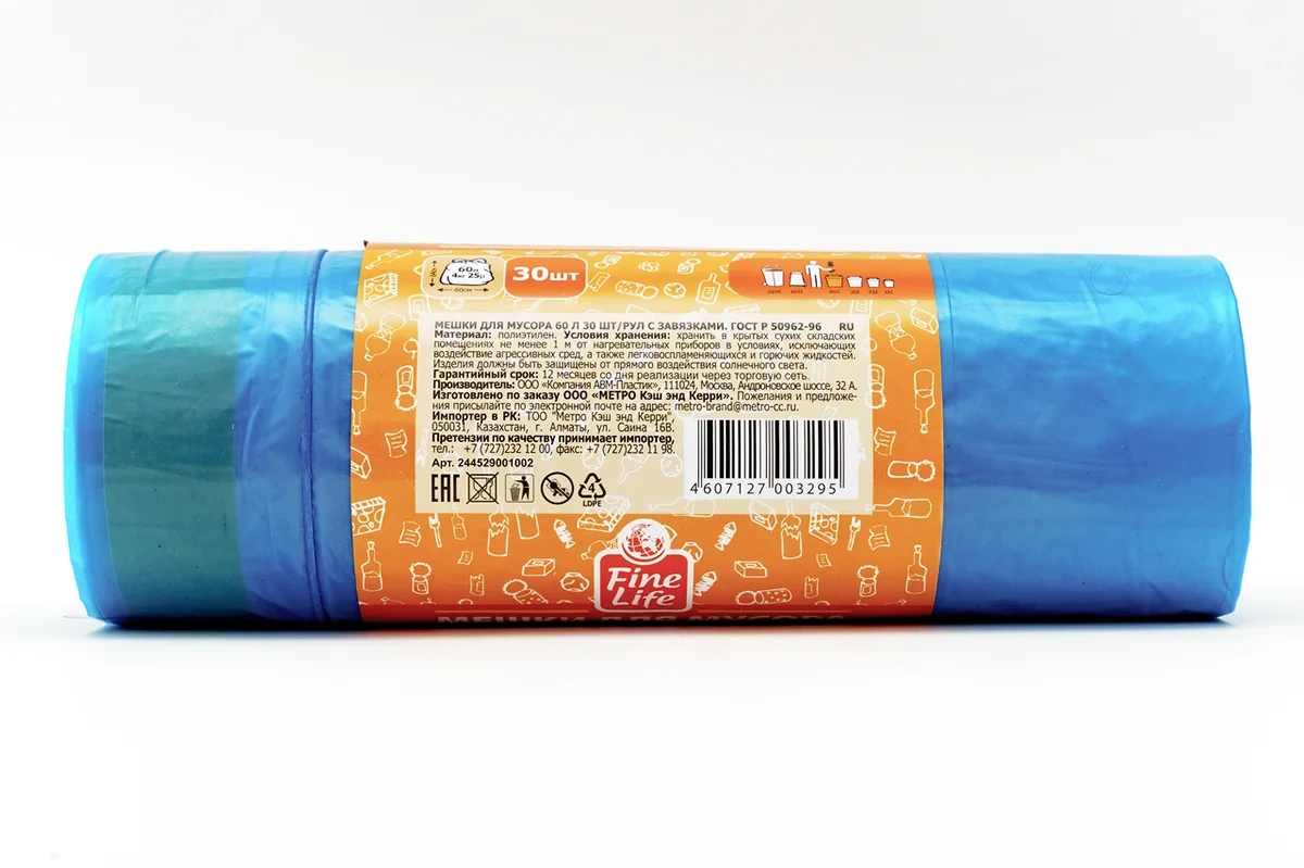 METRO PROFESSIONAL Мешки для мусора с завязками, 60 л, 30 шт. подходят для использования дома, в офисе. Это одноразовые изделия, которые предназначены для сбора мусора. Их изготавливают из прочного полиэтилена. Этот материал полностью безопасен для человека. При контакте с пищевыми продуктами не выделяет вредных и токсичных веществ. Для удобства предусмотрены завязки, которые позволяют надежно закрыть мешок, когда он наполнится. Мешки способны выдерживать значительный вес. Они не имеют срока годности. Для их сохранности следует соблюдать правила, указанные производителем. Недопустимо хранить полиэтиленовые пакеты вблизи нагревательных приборов. Не следует оставлять их под прямыми солнечными лучами (на балконах, подоконниках и в других местах) или в помещениях с температурой выше 400С.