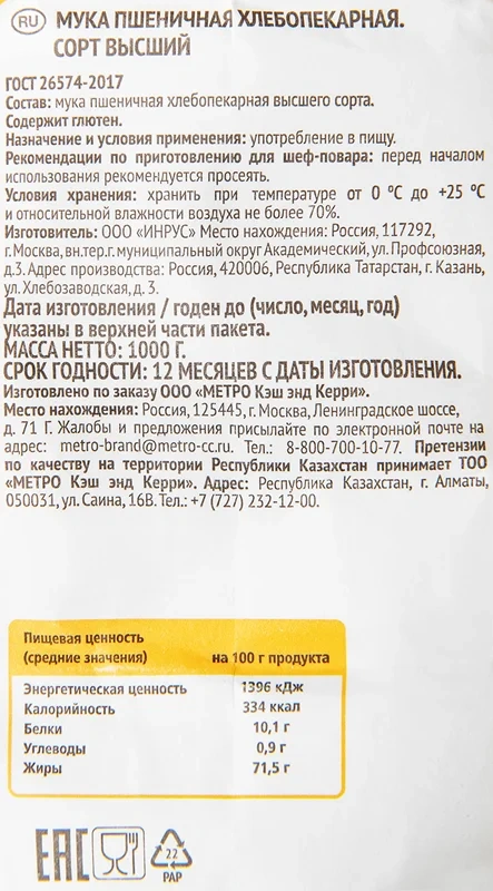 Мука пшеничная отлично подойдет для выпечки, тортов, пирожных и других блюдо. Не образует комков и превосходно пропекается. При замешивании позволяет получить однородное, упругое и эластичное тесто. Для достижения лучших результатов рекомендуется просеивать муку перед замешиванием. Содержит глютен. Не содержит красителей и искусственных ингредиентов.