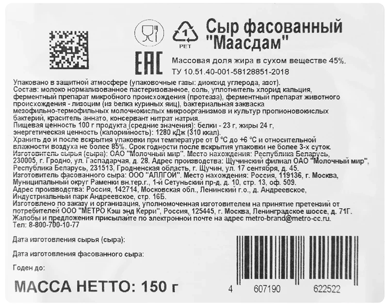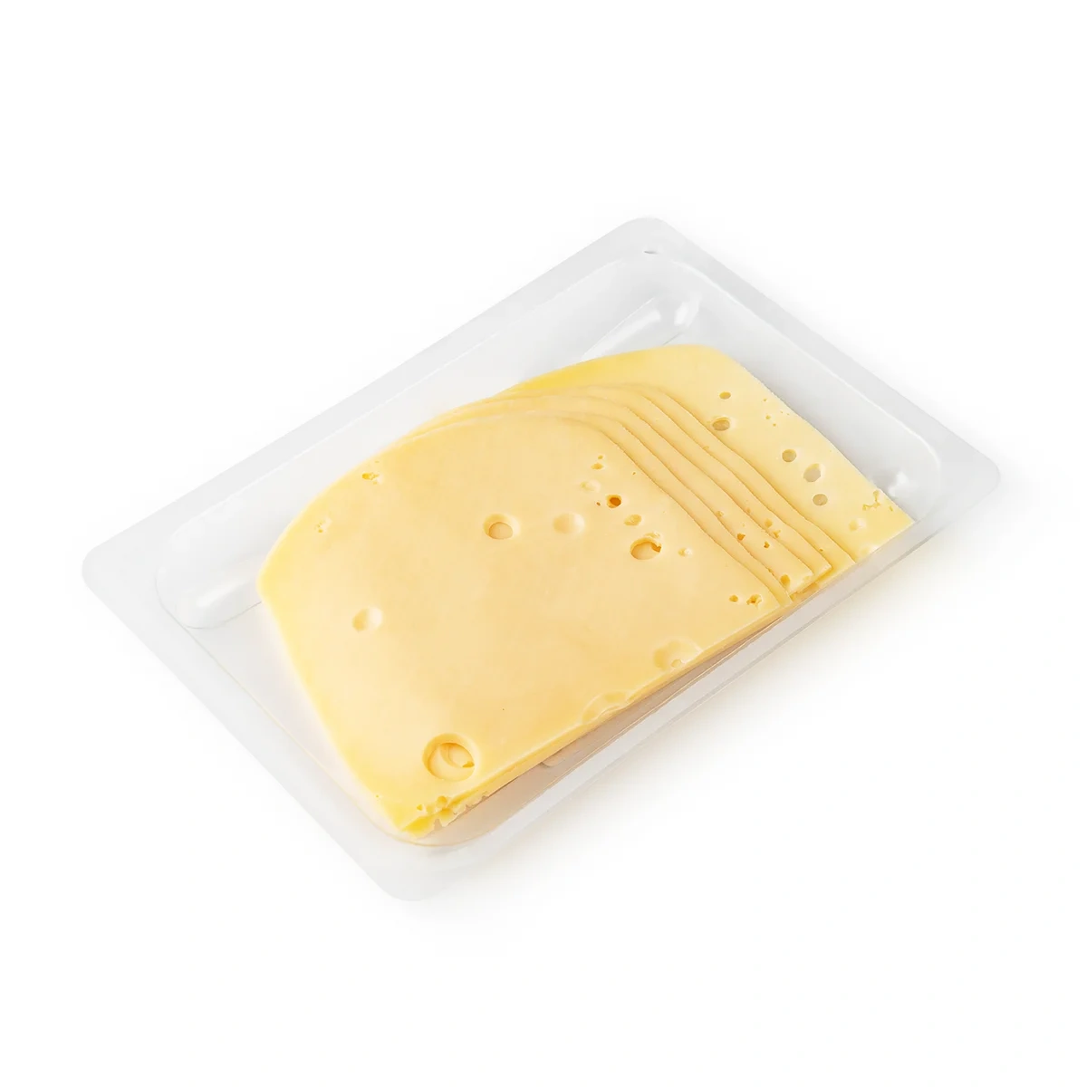 Сыр полутвердый фасованный Маасдам в нарезке Fine Life, массовая доля жира в сухом веществе 45%, Россия. Готов к употреблению.
