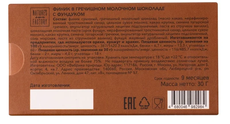 Финик Фабрика природы в гречишном молочном шоколаде с фундуком, 30г