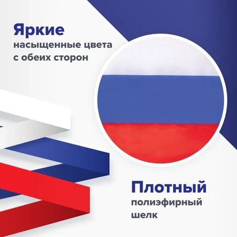 Государственный символ Российской Федерации представляет собой полотно из трёх равновеликих горизонтальных полос: верхней — белого, средней — синего и нижней — красного цвета, не содержит изображение герба РФ. Полотно флага оснащено карманом под флагшток и выполнено из полиэфирного шелка. Размер - 90х135 см. Флаг предназначен для использования на улице и в помещениях. Флагшток не входит в комплект.
