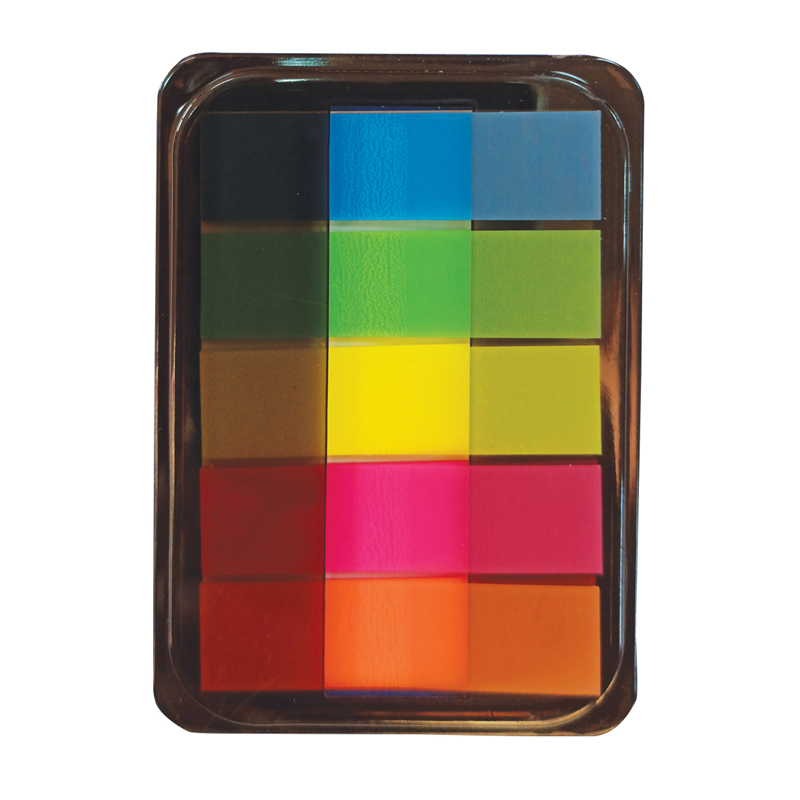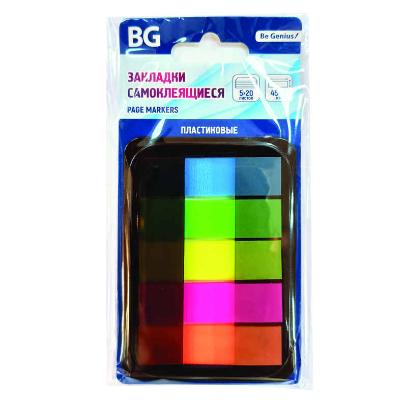 Закладки пластиковые самоклеящиеся в диспенсере. В упаковке 5 ярких неоновых цветов по 20 листов каждого. Размеры: 45*12 мм. Закладки могут служить пометками в документах, использоваться для записи краткой информации, для выделения текста. Прозрачный пластик, из которого изготовлены закладки, не скрывает при этом самого текста. Закладки клейкие легко удаляются, не оставляя следов и не повреждая бумагу. Клейкость: акриловая эмульсия на водной основе 32 Н/м. Цвета: голубой, оранжевый, зеленый, розовый, желтый