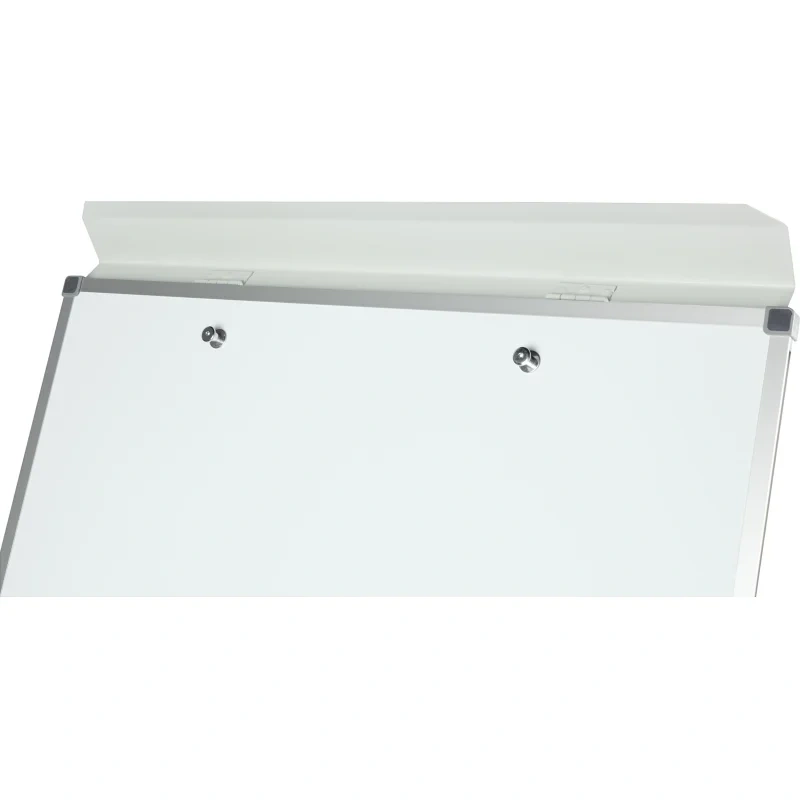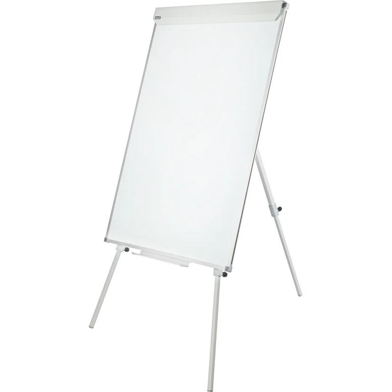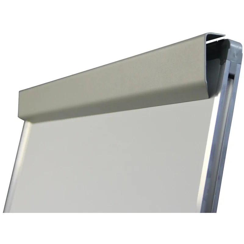 Мобильный флипчарт на треноге с маркерным покрытием. Высота регулируется, треноги имеют специальные винты, которые закручиваются на креплениях у ножек и можно регулировать высоту, до 180 см высота флипчарта (в полностью разложенном виде — чуть ниже, так как ноги будут под наклоном (около 170–175), минимальная высота не указывается так как ноги можно убрать заподлицо флипчарта. Предназначен для работ маркерами сухого стирания. Оснащен держателем для бумажного блокнота. Флипчарт, на который монтируется доска, выполнены из профиля прямоугольного сечения. Алюминиевая рама. На стойку нанесена порошковая покраска серого цвета. В комплект входит полочка для маркеров. Расширение треноги — 64 см. Для удаления пленки потяните за верхний свободный угол, пленка легко отойдет от рабочей поверхности. При необходимости проведите вдоль рамы канцелярским ножом.