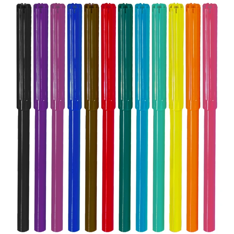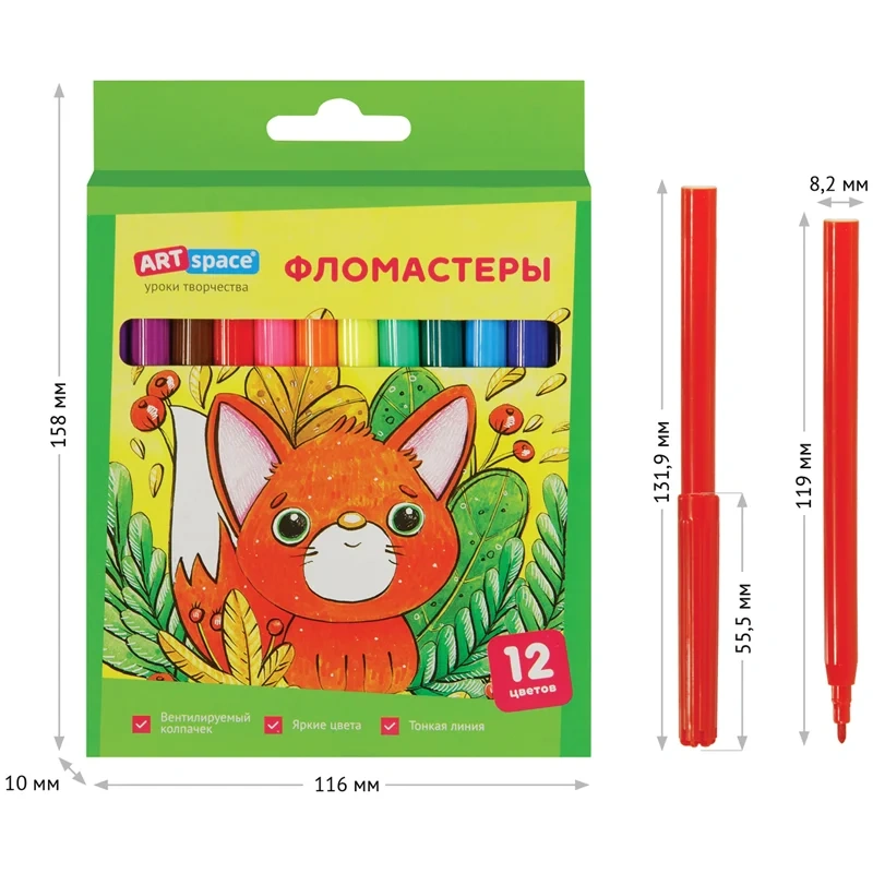 Набор фломастеров. 12 ярких цветов. Вентилируемый колпачок, смываемые чернила на водной основе. Упакованы в картонную коробку с подвесом.