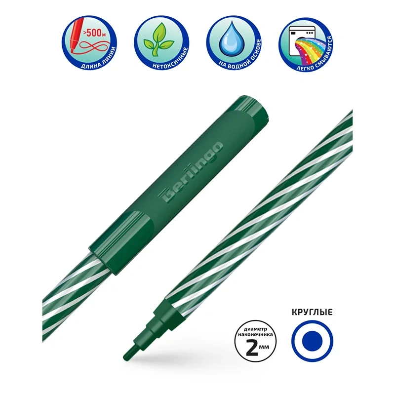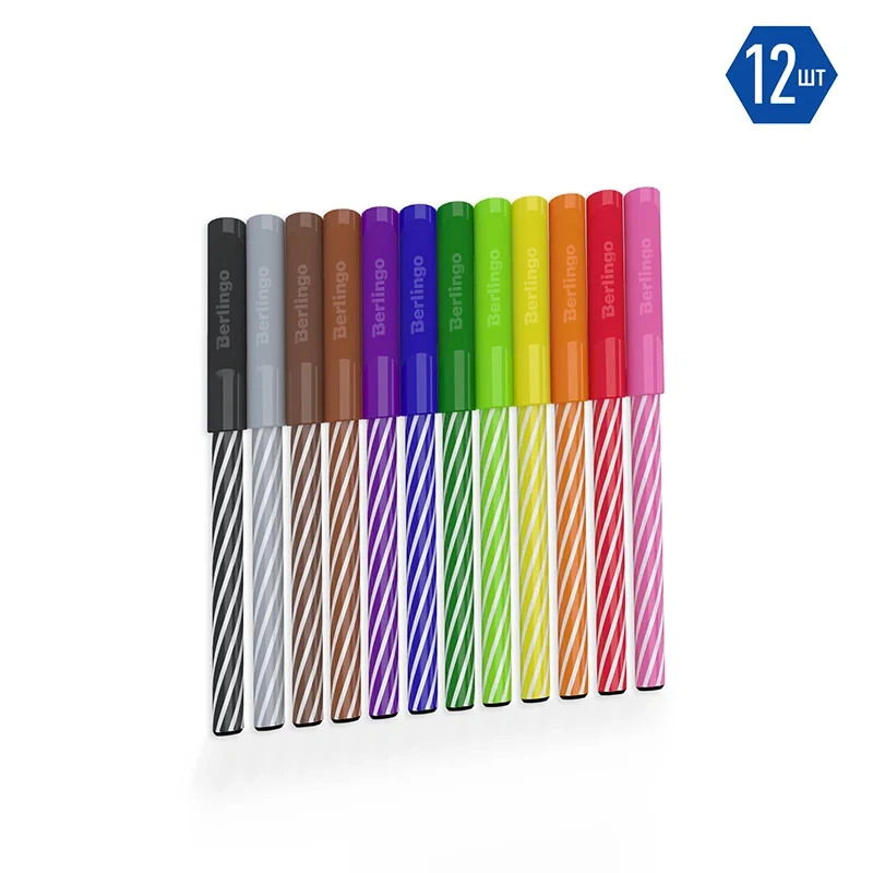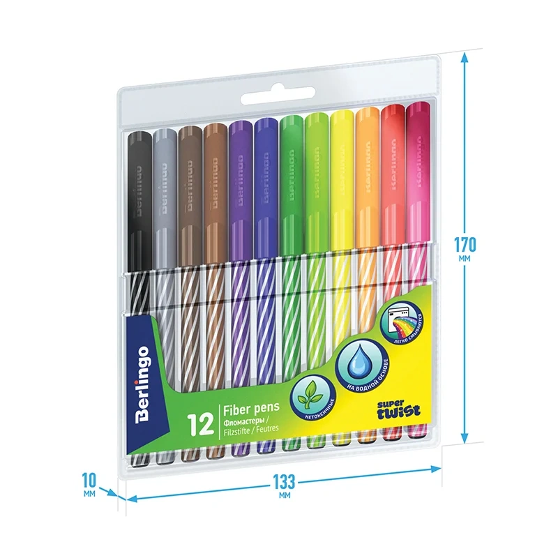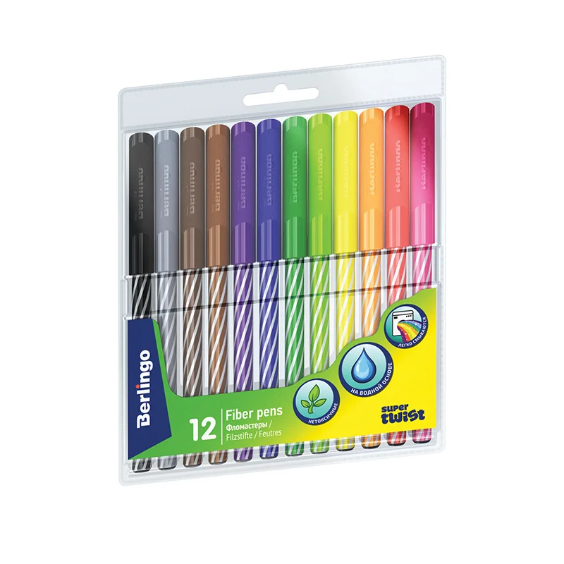 Фломастеры Berlingo серии SuperTwist представлены с легкосмываемыми чернилами и вентилируемым колпачком. Толщина линии письма составляет 2 мм, а длина линии письма - не менее 500 метров. В наборе 12 ярких цветов: оранжевый, красный, коричневый, светло-коричневый, зелёный, светло-зелёный, жёлтый, синий, чёрный, серый, розовый, фиолетовый. Корпус круглой формы изготовлен из полипропилена и имеет удобную зону захвата, а главное стильный дизайн. Тип наконечника – конический. Смываемые фломастеры на водной основе нетоксичны. Набор фломастеров упакован в блистер с европодвесом.