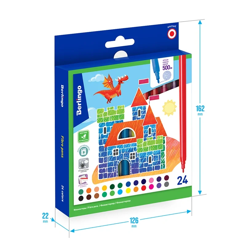 Фломастеры Berlingo серии «Замки» представлены с легкосмываемыми чернилами и вентилируемым прозрачным колпачком. Толщина линии письма составляет 2 мм, а длина линии письма - не менее 500 метров. В наборе 24 ярких цвета. Корпус круглой формы изготовлен из полипропилена и имеет удобную зону захвата. Тип наконечника – конический. Смываемые фломастеры на водной основе нетоксичны. Набор фломастеров упакован в лакированную картонную коробку с европодвесом.