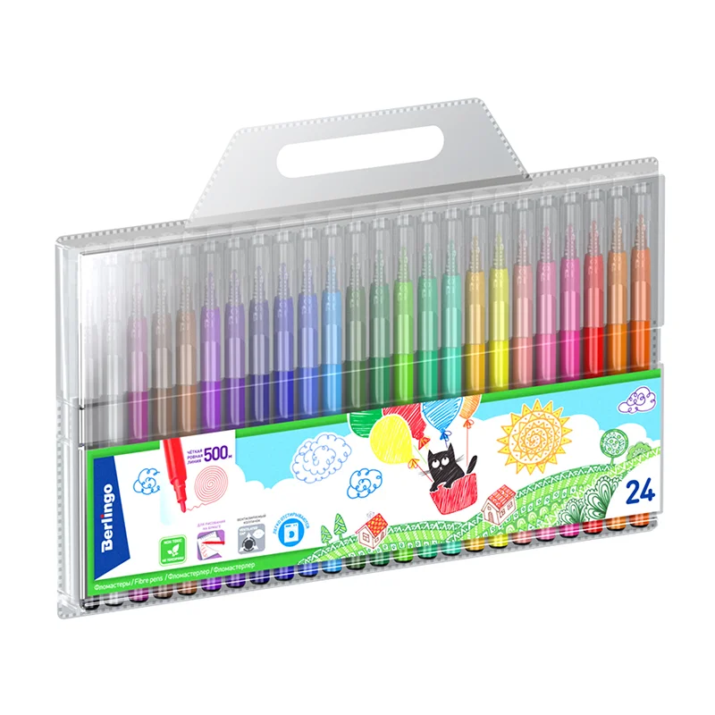 Фломастеры Berlingo серии «Жил-был кот» представлены с легкосмываемыми чернилами и вентилируемым прозрачным колпачком.Толщина линии составляет 2 мм, а длина линии письма - не менее 500 метров. В наборе 24 ярких цвета. Корпус круглой формы изготовлен из полипропилена и имеет удобную круглую зону захвата. Тип наконечника – конический. Смываемые фломастеры на водной основе нетоксичны. Набор фломастеров упакован в блистер с европодвесом.