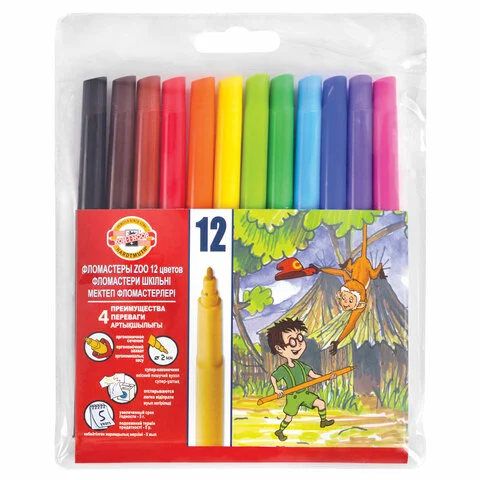 Фломастеры для рисования Koh-I-Noor Звери 12 цветов, трехгранные, смываемые
