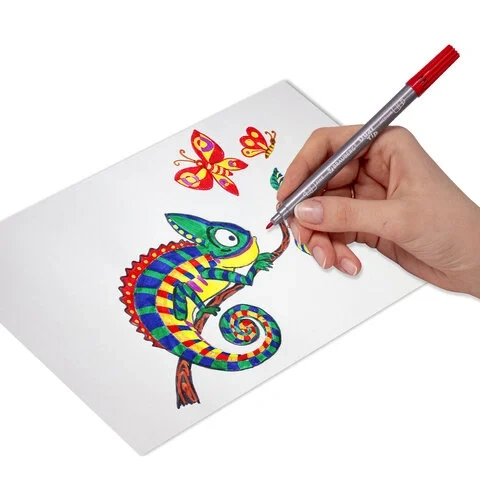 Фломастеры имеют удобную круглую форму корпуса, длина которого 164 мм, а диаметр составляет 9,6 мм. Процесс раскрашивания становится легким и приятным благодаря двустороннему наконечнику: с одной стороны тонкому с линией письма 1-2 мм и диаметром пишущего узла 2,3 мм, с другой стороны среднему с линией письма 2-3 мм и диаметром пишущего узла 3,5 мм. Фломастеры изготовлены на водной основе, поэтому практически не имеют запаха, не токсичны и легко смываются с большинства материалов и тканей. Быстросохнущие чернила предотвращают смазывание рисунка. Фломастеры обладают экономным расходом чернил, при этом длина линии письма достигает 500 метров. Благодаря полипропиленовому корпусу срок службы фломастеров значительно увеличивается, а вентилируемый колпачок не причинит вреда при попадании в дыхательные пути. Рекомендованы для детей от 3-х лет.