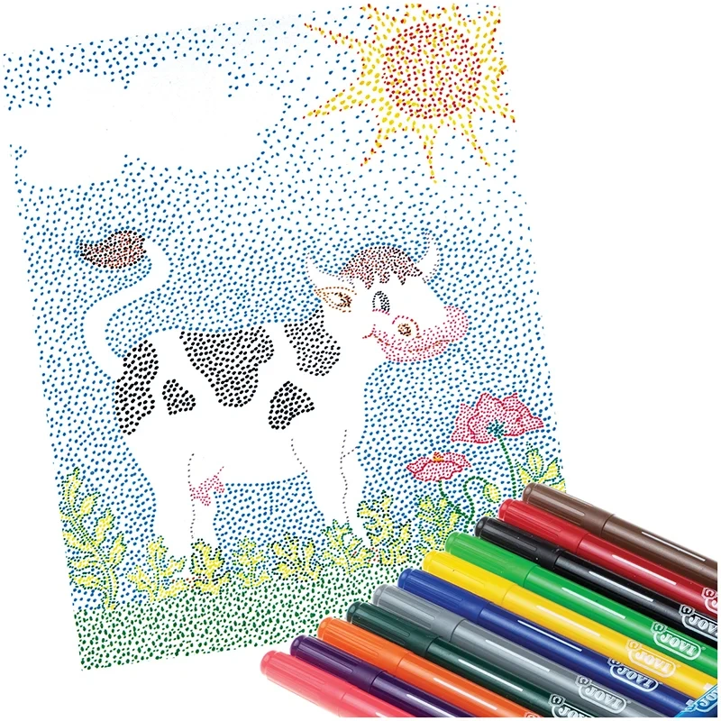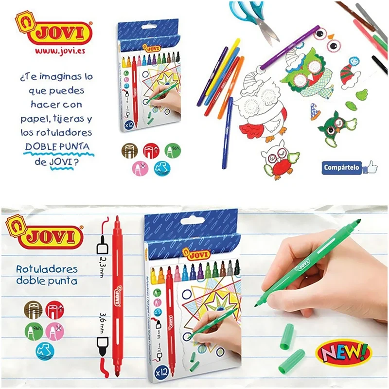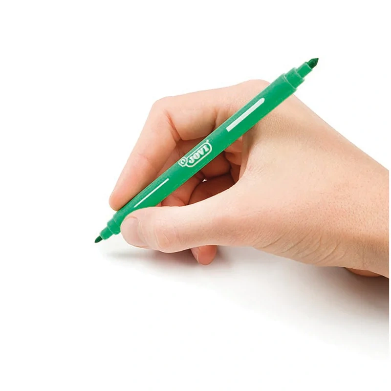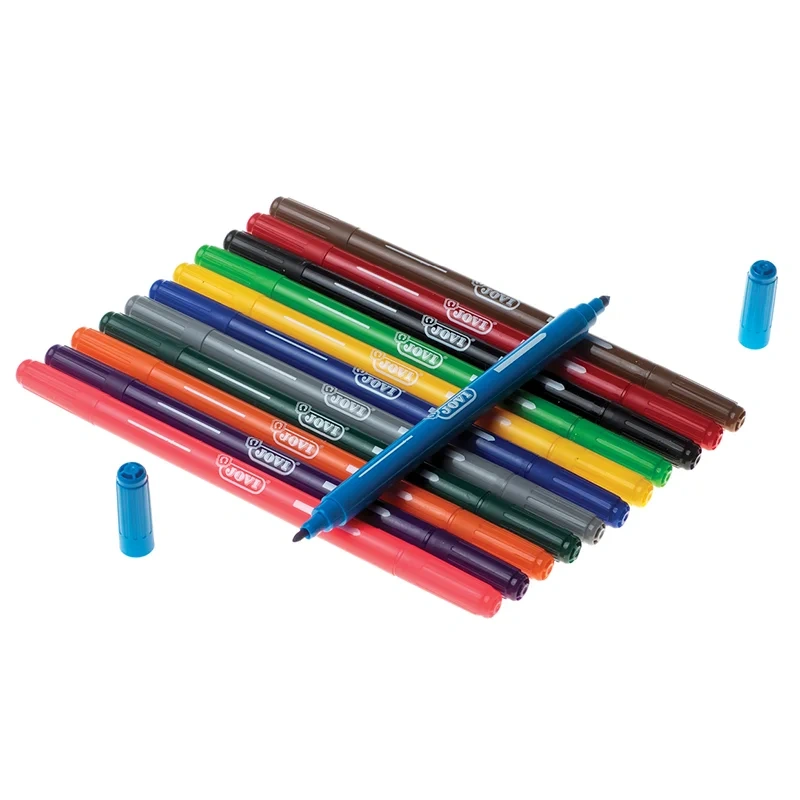 Двусторонние фломастеры JOVI с двумя пишущими узлами - 2,3 и 3,6 мм и вентилируемым колпачком. В наборе 12 цветов с особо прочным наконечником: жёлтый, красный, оранжевый, чёрный, коричневый, голубой, синий, розовый, фиолетовый, серый, зелёный, темно-зелёный.