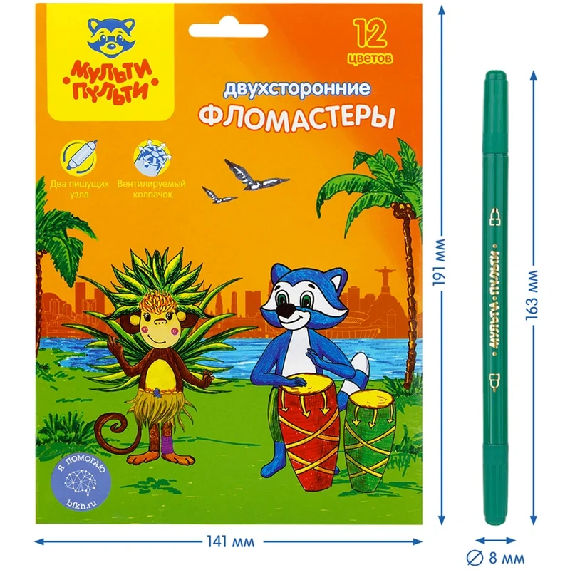 Двусторонние фломастеры «Мульти-Пульти» серии «Енот в Бразилии» представлены со смываемыми чернилами, вентилируемым колпачком и двумя пишущими узлами – 2 мм и 4 мм. Длина письма – 400 метров. В наборе 12 ярких цветов: сереневый, жёлтый, розовый, красный, салатовый, зелёный, коричневый, голубой, оранжевый, синий, фиолетовый, чёрный. Корпус круглой формы из полипропилена имеет удобную круглую зону захвата. Фломастеры подходят для детей старше 3-х лет. Чернила на водной основе легко смываются водой с рук ребенка и отстирываются от одежды, не токсичны. Набор фломастеров упакован в картонную лакированную коробку с петлёй-европодвесом.