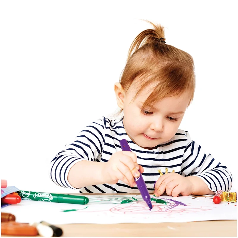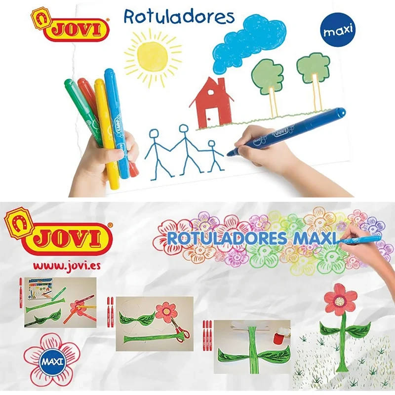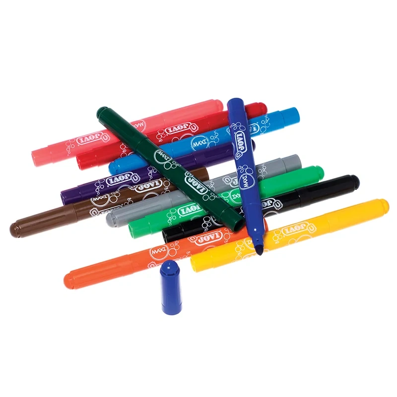 Фломастеры представлены с коническим наконечником. Утолщённая форма корпуса удобна для маленьких детей и позволяет легко держать фломастер в руке. Фломастеры выдерживают сильный нажим, наконечник не вдавливается внутрь. Полностью безопасные гипоаллергенные чернила на водной основе с пищевыми красителями. Фломастеры не высыхают без колпачка в течение 96 часов. Специальные вентилируемые колпачки обеспечивают прохождение воздуха при случайном проглатывании. Фломастеры JOVI легко смываются с кожи и отстирываются с большинства видов тканей. Упакованы в картонную коробку с европодвесом.