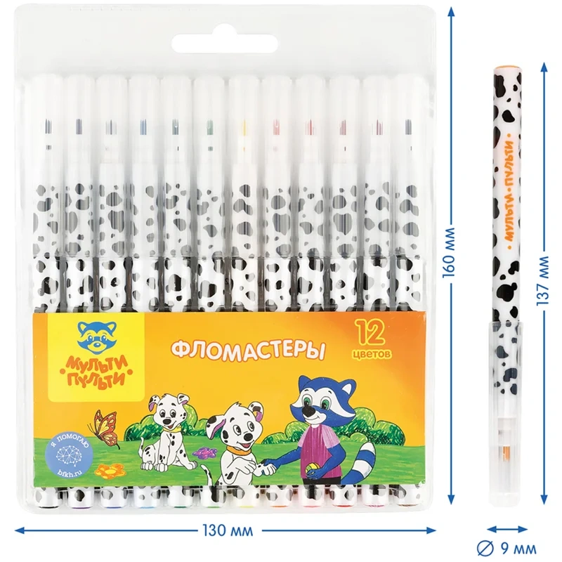 Фломастеры «Мульти-Пульти» серии «Енот и далматинцы» представлены с легкосмываемыми чернилами и вентилируемым колпачком. Толщина линии конического наконечника – 2 мм. Длина письма – не менее 310 метров. В наборе 12 цветов. Корпус круглой формы изготовлен из полипропилена, имеет удобную круглую зону захвата. На белых корпусах фломастеров – оригинальный рисунок, привлекающий дополнительное внимание ребёнка. Фломастеры сохраняют стабильный цвет при письме на протяжении всего использования. Смываемые, на водной основе, нетоксичны. Упакованы в блистер.