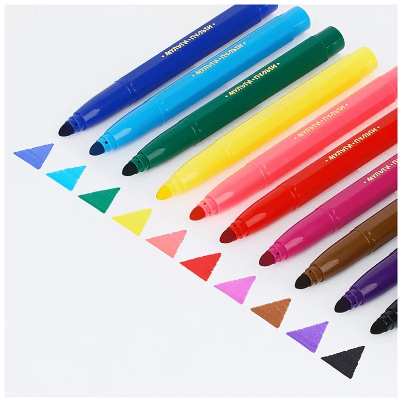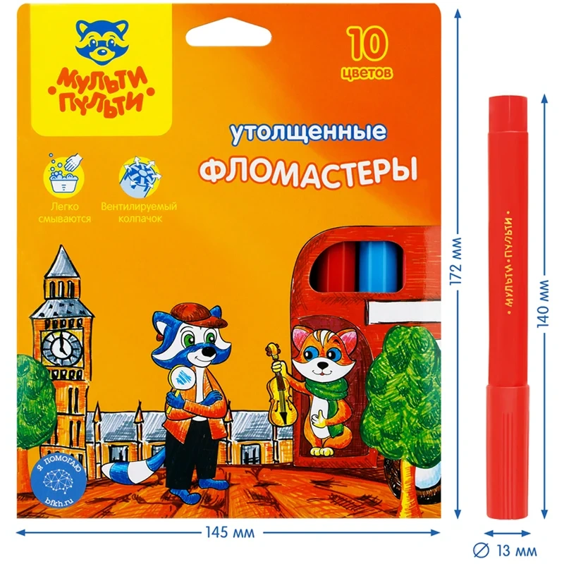 Фломастеры «Мульти-Пульти» серии «Енот в Англии» представлены со смываемыми чернилами, вентилируемым колпачком и широким наконечником. Длина письма составляет 400 метров. Толщина линии письма составляет 7 мм. В наборе 10 ярких цветов: розовый, сереневый, жёлтый, зелёный, голубой, чёрный, синий, фиолетовый, красный, коричневый. Утолщённый корпус шестигранной формы имеет удобную зону захвата. Тип наконечника – конический. Наиболее удобны для детей дошкольного возраста. Смываемые чернила на водной основе нетоксичны. Набор фломастеров упакован в картонную коробку с европодвесом.
