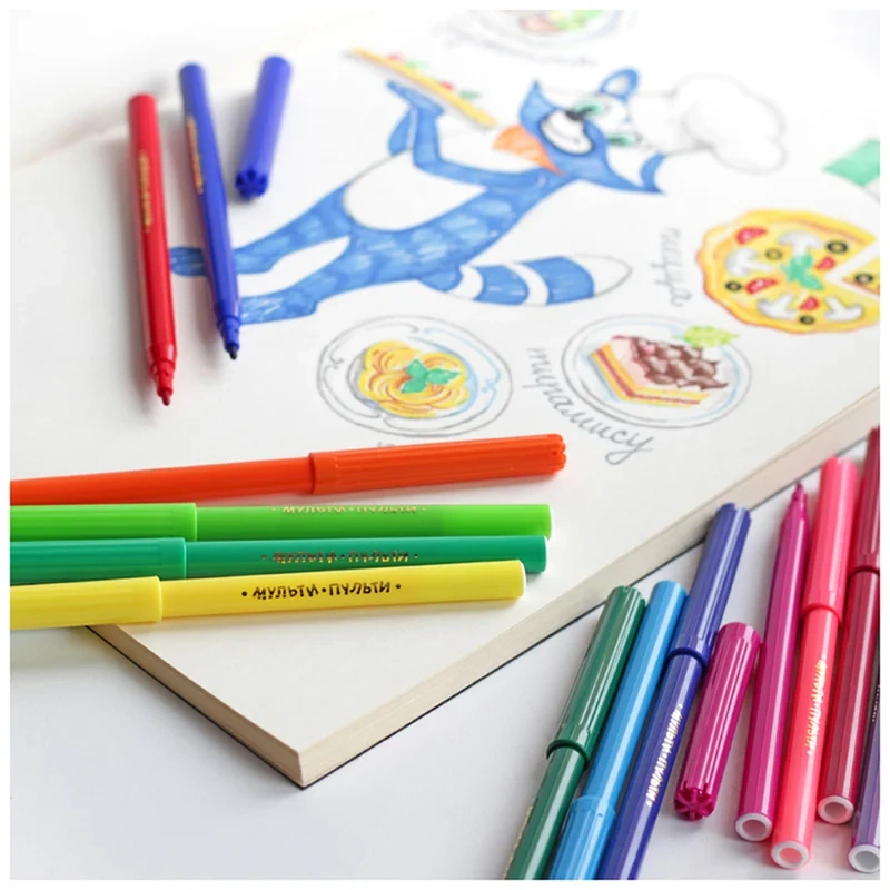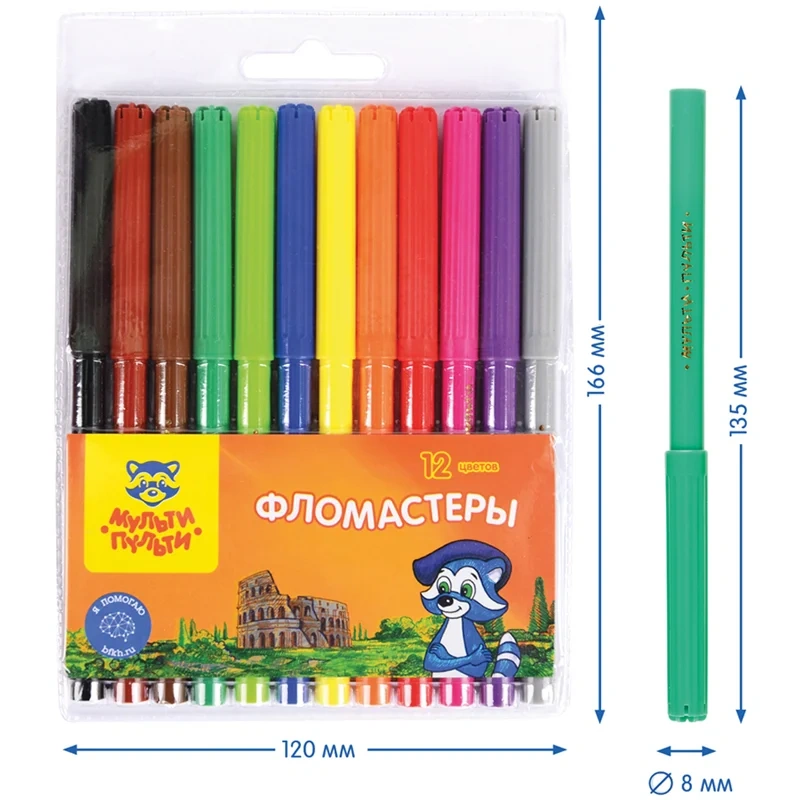 Фломастеры «Мульти-Пульти» серии «Енот в Италии» представлены с легкосмываемыми чернилами и вентилируемым колпачком. Тип наконечника – конический. Толщина линии составляет 2 мм, длина письма – не менее 500 метров. В наборе 12 цветов фломастеров: чёрный, коричневый, кирпичный, зелёный, салатовый, синий, жёлтый, оранжевый, красный, розовый, фиолетовый, серый. Корпус круглой формы изготовлен из полипропилена и имеет удобную круглую зону захвата. Фломастеры сохраняют стабильный цвет при письме на протяжении всего использования. Смываемые фломастеры на водной основе нетоксичны. Упакованы в блистер.