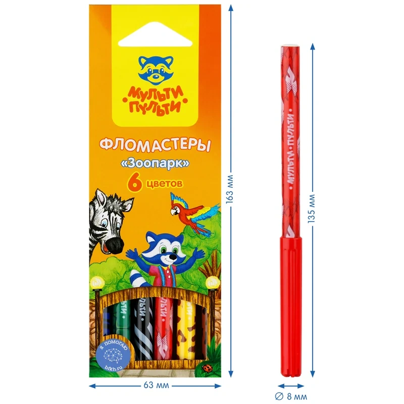 Фломастеры «Мульти-Пульти» серии «Зоопарк» представлены с легкосмываемыми чернилами и вентилируемым колпачком. В наборе 6 ярких цветов. Корпус круглой формы изготовлен из полипропилена и имеет удобную круглую зону захвата. Тип наконечника – конический. Толщина линии составляет 2 мм, длина письма – не менее 450 метров. Фломастеры сохраняют стабильный цвет при письме на протяжении всего использования. Смываемые фломастеры на водной основе нетоксичны. Упакованы в картонную коробку.