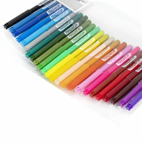 Обладают расширенной палитрой - 24 цвета. Имеют удобную круглую форму корпуса, длина которого 135 мм, а диаметр - 8,4 мм. Благодаря толщине линии письма 1 мм и диаметру пишущего узла 1,8 мм процесс раскрашивания становится легким. Длина письма составляет 600 м: такого расхода хватит надолго. Фломастеры легко смываются с большинства материалов и кожи. Корпус изготовлен из качественного полипропилена, который значительно продлевает срок службы фломастеров. Колпачок имеет специальные прорези для вентиляции, которые способствуют прохождению воздуха при попадании в дыхательные пути малыша. Рекомендованы для детей от 3-х лет.