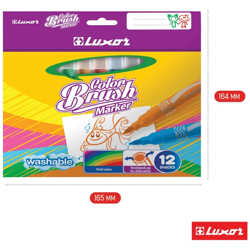 Фломастеры Luxor Colour Brush специально предназначены для детей от 3-х лет. Они имеют специальное строение пишущего узла, который при сильном нажатии не деформируется и не вдавливается. Чернила на водной основе легко отстирываются с одежды и смываются с рук водой. Фломастеры Luxor представлены с круглой формой корпуса и безопасным вентилируемым колпачком, который с лёгкостью снимается и надевается.