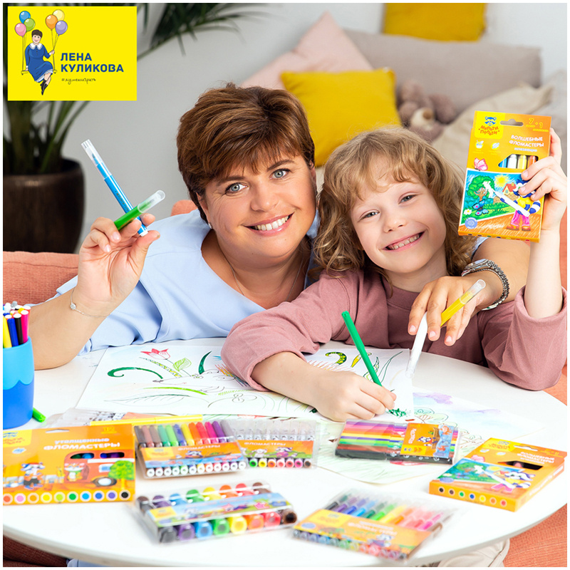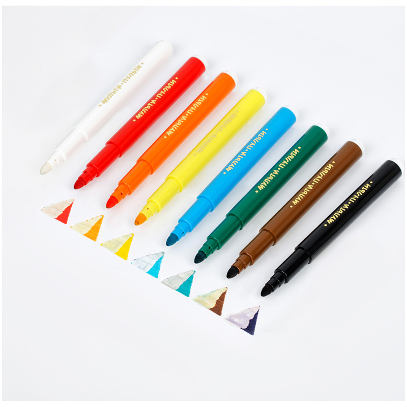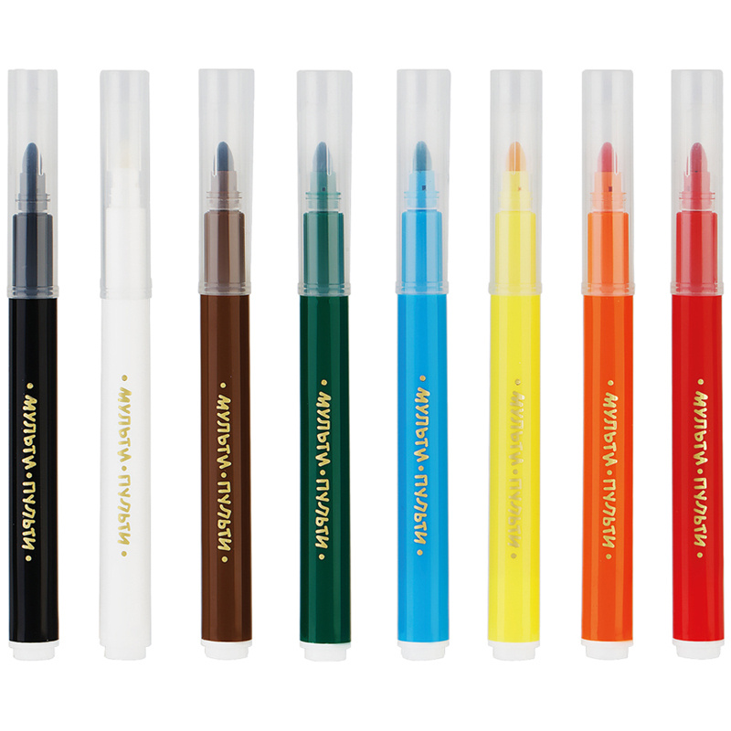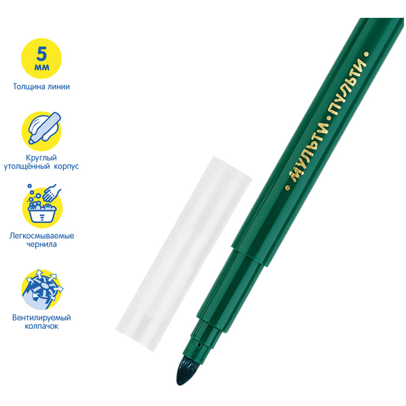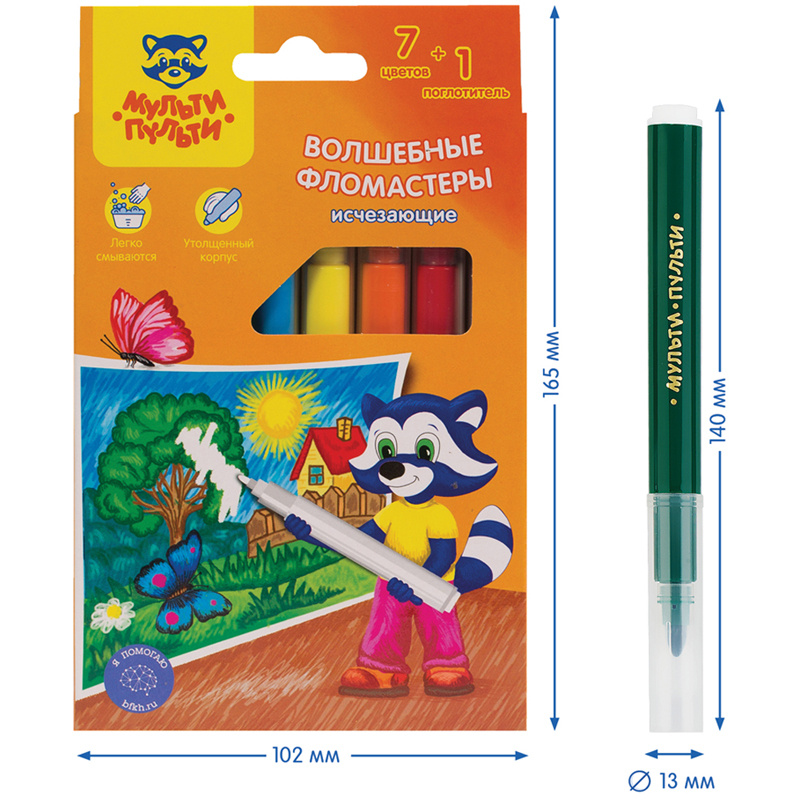 Фломастеры «Мульти-Пульти» серии «Приключения Енота» представлены со смываемыми чернилами, вентилируемым колпачком и утолщённым корпусом. Длина письма – 300 метров. Толщина линии письма составляет 5 мм. В наборе 7 ярких цветов: красный, оранжевый, жёлтый, чёрный, коричневый, голубой, белый.Также в наборе 1 фломастер-преобразователь, который позволяет стирать цвета. Утолщённый корпус круглой формы имеет удобную зону захвата. Тип наконечника – конический. Пишущий узел защищен от продавливания. Фломастеры подходят для детей старше 3-х лет. Смываемые чернила на водной основе нетоксичны. Набор фломастеров упакован в картонную коробку с европодвесом.