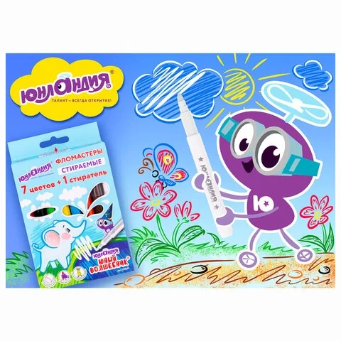 Фломастеры стираемые ЮНЛАНДИЯ 'ЮНЫЙ ВОЛШЕБНИК', 7 цветов+1 стиратель, ударопрочный наконечник, венти