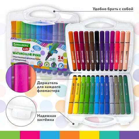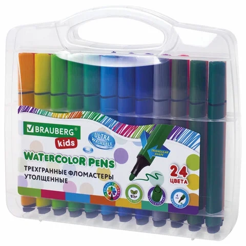 Фломастеры в пластиковом кейсе трехгранные утолщенные УЛЬТРАСМЫВАЕМЫЕ, BRAUBERG KIDS, 24 цвета, 1521