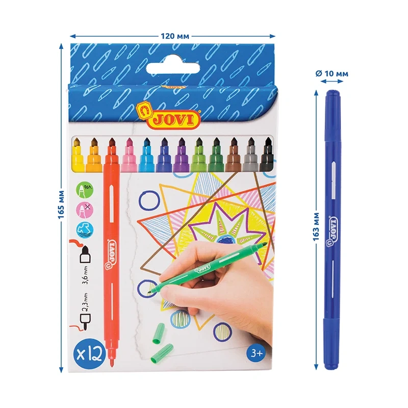 Фломастеры двусторонние JOVI, 12цв., смываемые, картон, европодвес