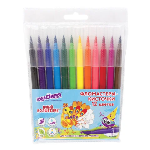 Фломастеры с кистью ЮНЛАНДИЯ 'ЮНЫЙ ВОЛШЕБНИК', 12 цветов, вентилируемый колпачок, 151430