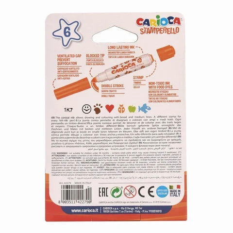 Фломастеры-штампы двусторонние CARIOCA (Италия) 'Stamperello', 6 цветов, смываемые, 42279