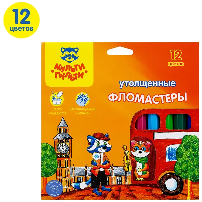 Фломастеры для рисования Мульти-Пульти Енот в Англии 12 цветов, смываемые, утолщенные