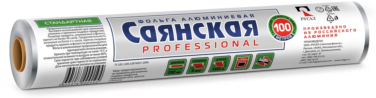 Фольга Саянская Professional, 290 мм, 9 мкм, 100 м незаменима на каждой кухне. С ее помощью запекают блюда в духовке и на мангале, формируют из нее формочки и лодочки. В нее также оборачивают продукты для дальнейшего хранения в холодильнике, чтобы они не заветрились и не зачерствели. Предназначена для профессионального и бытового использования. Сохраняет свежесть и аромат продуктов, предотвращая их высыхание. Фольга имеет высокую плотность. Достаточно одного слоя, чтобы обернуть ею рыбу и овощи, а затем отправить в духовку. Фольга прекрасно держит температуру внутри и позволит длительное время поддерживать блюда теплыми. В рулоне – 100 метров фольги. Этого хватит на длительное время. Способна выдерживать температуру до 600 градусов. Фольга Саянская нетоксична и безопасна для использования в контакте с пищевыми продуктами, она препятствует возникновению и размножению бактерий. Высокое качество – основной приоритет при производстве Саянской фольги.