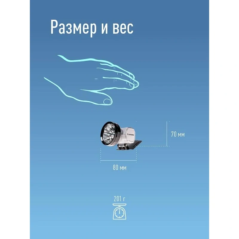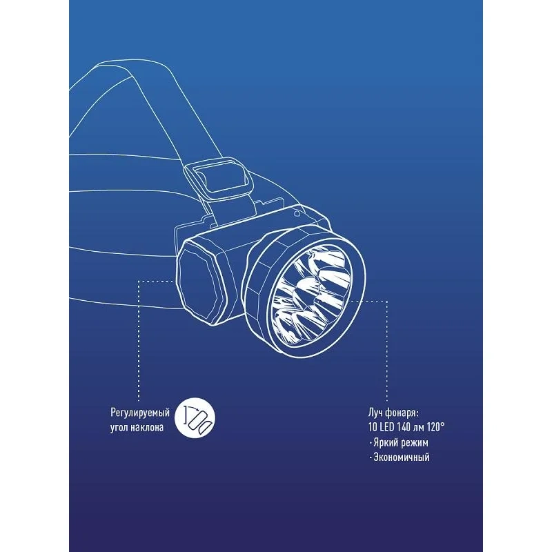 Фонарь налобный работает как от штатного аккумулятора, так и от батареек AA. Имеет три режима работы: яркий, средний и экономичный. В комплект входит аккумулятор и резинка для надевания фонаря на голову. Яркость свечения составляет 140 лм, дальность луча достигает 100 м. Встроено 10 светодиодов. Фонарь обеспечивает до 24 часов автономной работы. Ёмкость аккумулятора — 0.3 Ач. Размер корпуса 80×65×75 мм, вес 240 г. Корпус выполнен из пластика в чёрно-серебристом цвете, степень защиты IP33.