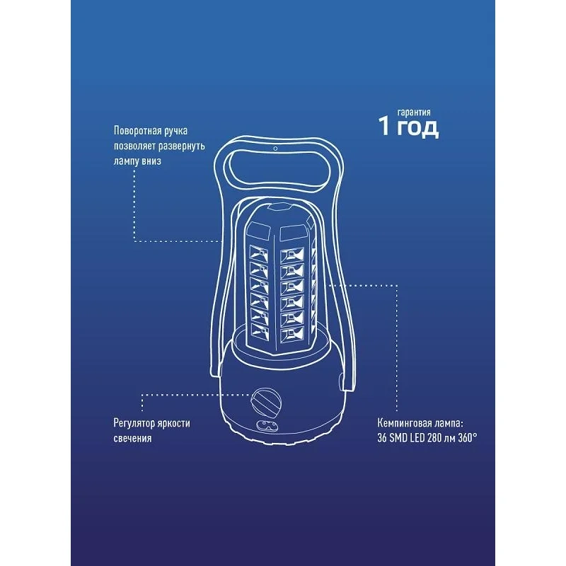 Кемпинговый светодиодный фонарь предназначен для использования в походных условиях, на даче или при отключении электричества. Он оснащён 36 светодиодами с нейтральным белым светом и регулируемым уровнем яркости.
